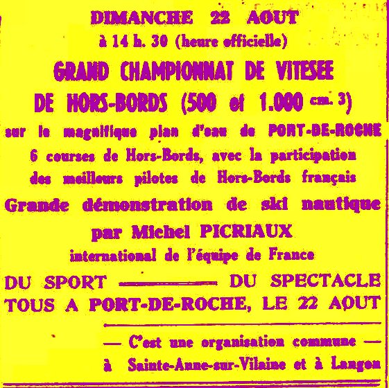- Ces courses équestres perdurèrent quelque temps après 1945, jusque dans les années cinquante, pour être remplacées par des courses de stock-cars (circuits limités par des bottes de paille). Puis la fête se transporta tout à côté vers Port-de-Roche sur la Vilaine avec des courses de hors-bords agrémentées de joutes nautiques.