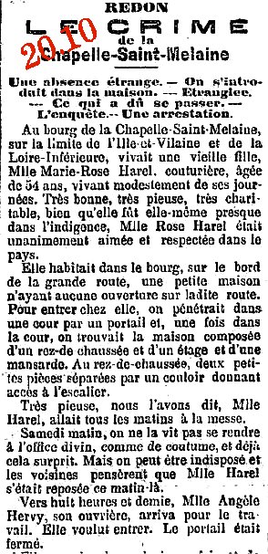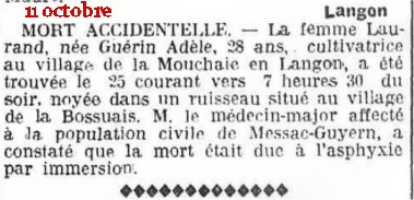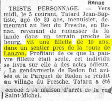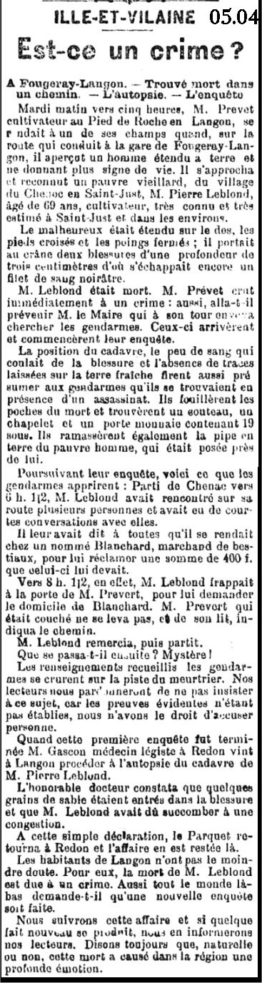 Si l'enfant à bien été retrouvé dans la Vilaine côté Langon, une rapide enquête (de 2015) permet de préciser que la mère de l'enfant, Melle Lévêque n'avait pas de lien avec les Lévêque de la Glénais en Langon. De même la famille employeuse habitait le village de Basse Lande à Ste Anne/Vilaine. (N.D.L.R.)