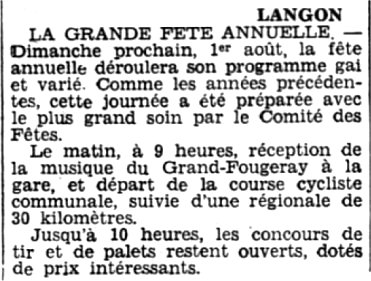 Accidents - Vol de poules - Outrages à agent - Mais aussi les transports (Chemins de Fer) qui s'adaptent aux événements; ici, en l'occurrence pour les courses hippiques de Langon... où l'on découvre l'importance de ce loisir sur la commune - L'électrification s'étend - Nouveaux tarifs téléphoniques. |